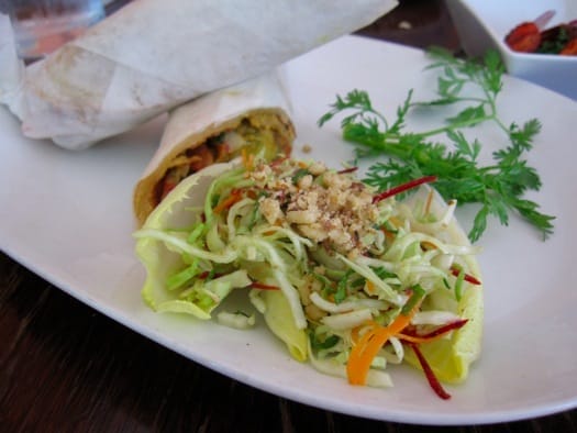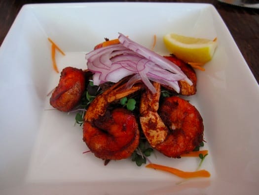 Prawn Frankie ($13) is a lunchtime-only highlight, a supple roti “burrito” brushed with egg whites and filled with spiced tomato sauce, marinated onions, crunchy cucumbers and cilantro chutney. In this case, the filling was sweet shrimp, though chicken and paneer are also available. The side was a nice touch, crisp, bitter endive leaves topped with a light slaw and crushed peanuts.